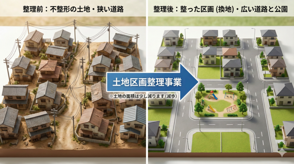 「元の土地」から「新しい土地(換地)」へとお引越しするイメージですね。ただし、道路や公園を作るために土地を使いますから、戻ってくる土地の面積は少し減ってしまいます。でも、その分だけ街が便利になり、土地の価値が上がるので、プラスマイナスゼロ(あるいはプラス)と考えます。この大枠の仕組みだけ、まずは頭の片隅に置いておいてください。