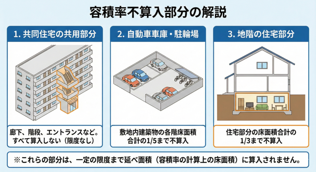 | 地階の住宅部分(地下室など) | 建物の住宅部分の床面積の合計の1/3まで不算入 |