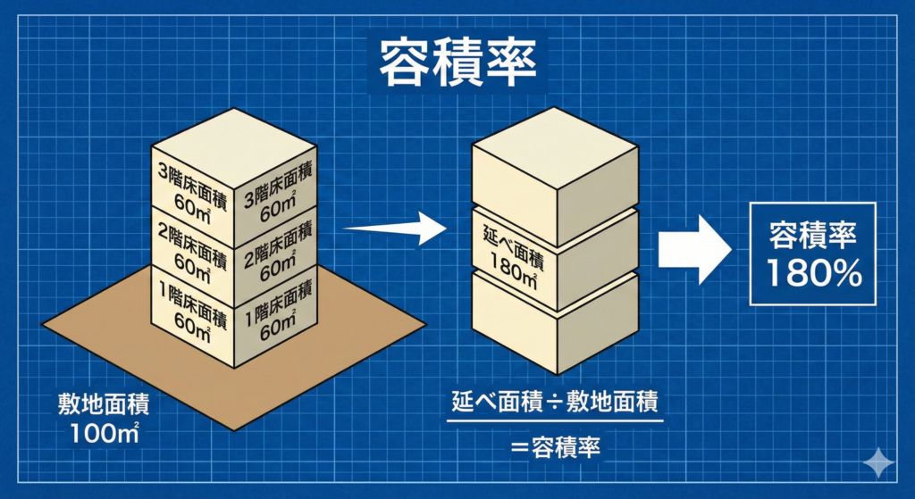 例えば、敷地が100㎡で容積率が200%なら、延べ面積200㎡までの建物が建てられます。1階が100㎡、2階が100㎡の2階建てでも良いですし、各階50㎡の4階建てでも構いません(高さ制限などは一旦置いておきます)。つまり、「その土地に、どれくらいの床面積を持つ建物を積み上げられるか」という限界値を示すのが容積率なんです。