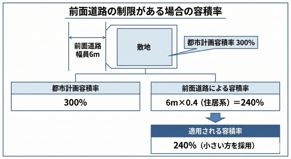 さて、ここからが本番です。宅建試験で頻出なのが、「指定された容積率(都市計画容積率)をそのまま使ってはいけないケースがある」というひっかけ問題です。これを攻略するには、目の前の道路(前面道路)の幅員をチェックする必要があります。