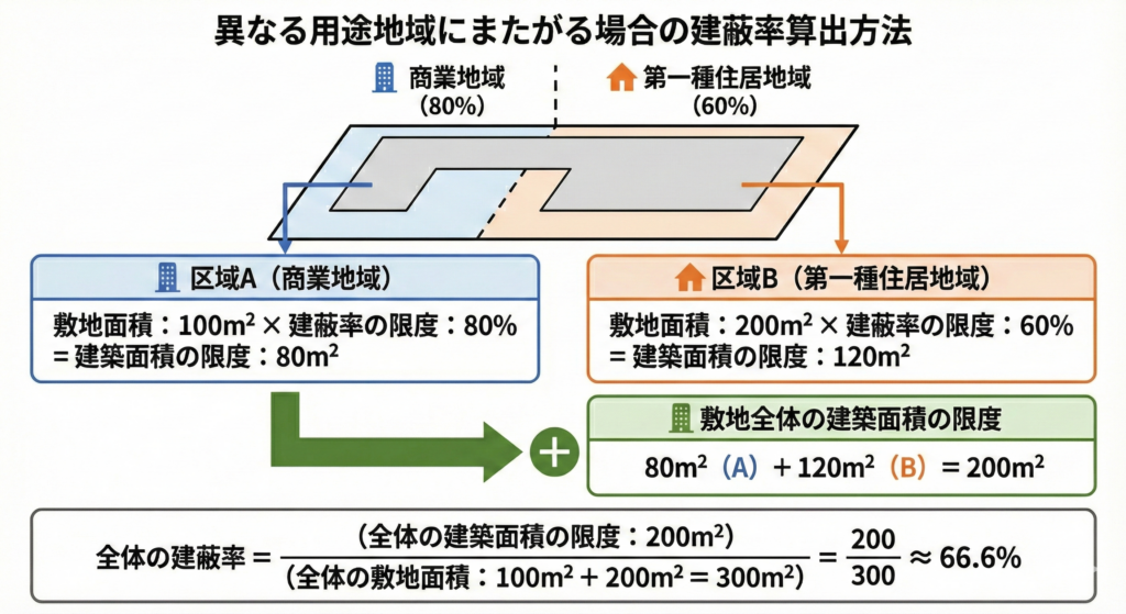 この場合、「厳しい方に合わせる」のではありません。それぞれの地域の面積に応じた「加重平均(按分)」で計算します。容積率と同じ考え方ですね。